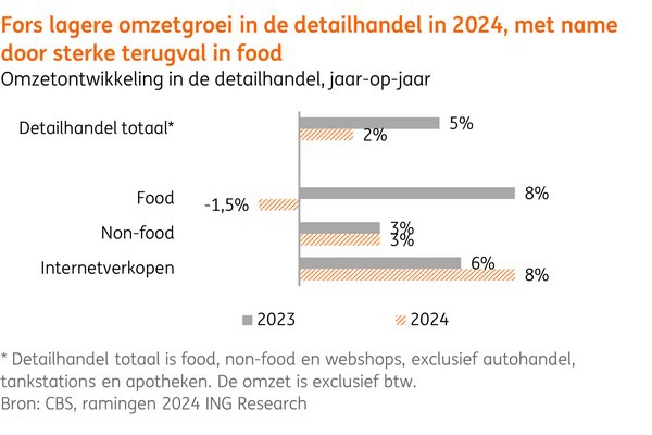 De omzetgroei in de detailhandel laat een wisselend beeld zien dit jaar en valt over de breedte fors terug van 5% in 2023 naar 2% dit jaar. Bij supermarkten is er voor het eerst in twintig jaar sprake van een omzetkrimp als gevolg van het tabaksverbod dat per 1 juli jl. is ingegaan. Anderzijds nemen door een verbeterde koopkracht de bestedingen van consumenten in de non-food en e-commerce dit jaar toe, al is het met wat haperingen. Zo is het consumentenvertrouwen onlangs weer enigszins verslechterd.