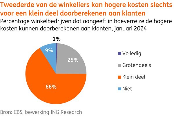 Naar verwachting wordt in 2024 door consumenten meer uitgegeven aan persoonlijke verzorging en schoenen en minder aan woninginrichting. Het blijven uitdagende tijden voor retailers door onder meer aanhoudende personeelstekorten, stijgende huur- en loonkosten en een laag consumentenvertrouwen. Slechts een kwart van de winkeliers zegt de hogere kosten volledig of grotendeels door te kunnen berekenen aan de consument. We verwachten dan ook dit jaar opnieuw meer faillissementen, met name in de non-food. Dit blijkt uit het nieuwe vooruitzicht retail van ING Research.