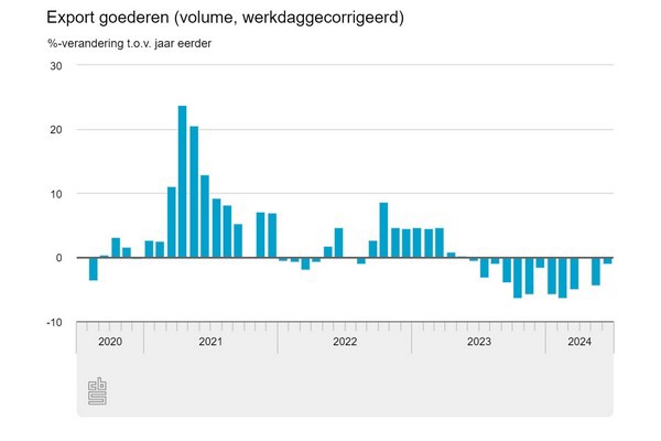 Het volume (werkdaggecorrigeerd) van de goederenexport was in juni 1,0 procent kleiner dan in juni 2023, meldt het CBS. Vooral de uitvoer van machines, aardolieproducten, voedings- en genotmiddelen en transportmiddelen was lager dan een jaar eerder. Het volume van de goederenimport was in juni 0,1 procent kleiner dan in juni 2023.
