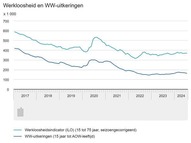 In juli 2024 waren 370 duizend mensen van 15 tot 75 jaar werkloos. Dat is, net als in mei en juni, 3,6 procent van de beroepsbevolking. Het aantal werklozen is in de afgelopen drie maanden met gemiddeld 2 duizend per maand afgenomen. Het aantal werkenden nam in deze periode ook af met gemiddeld 2 duizend per maand. Dit meldt het CBS op basis van nieuwe cijfers. UWV registreerde eind juli 164 duizend lopende WW-uitkeringen, 4 duizend minder dan eind juni.