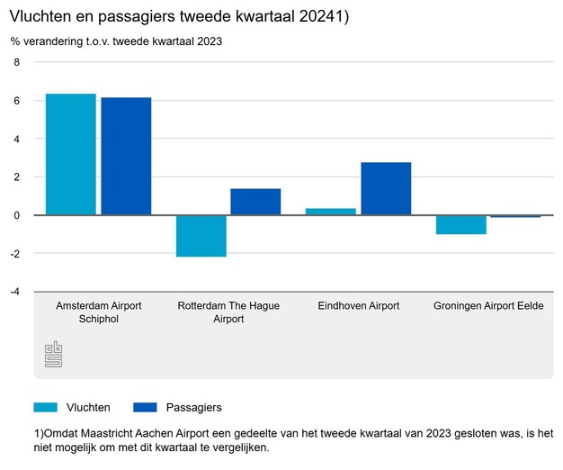Amsterdam Airport Schiphol was in het tweede kwartaal van 2024 goed voor 87 procent van zowel het totaal aantal vluchten als vervoerde passagiers van en naar Nederland. Het aantal vluchten in het tweede kwartaal van 2024 steeg tot 122 duizend, ruim 6 procent meer dan een jaar eerder. Het aantal passagiers nam in die periode ook met ruim 6 procent toe, tot 17,4 miljoen.