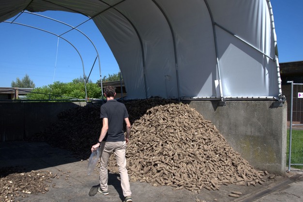 Om de biologische activiteit in de reactor levend te houden, is er voldoende energierijke voeding zoals witlofwortelen nodig. Door de slechte weersomstandigheden in 2023 waren witlofwortelen beperkt voorradig en daarom moeilijk te verkrijgen. Om het vergistingsproces draaiende te houden, werd aanvullend kuilmaïs en enkele andere reststromen zoals prei en kool aan de reactor toegevoegd.