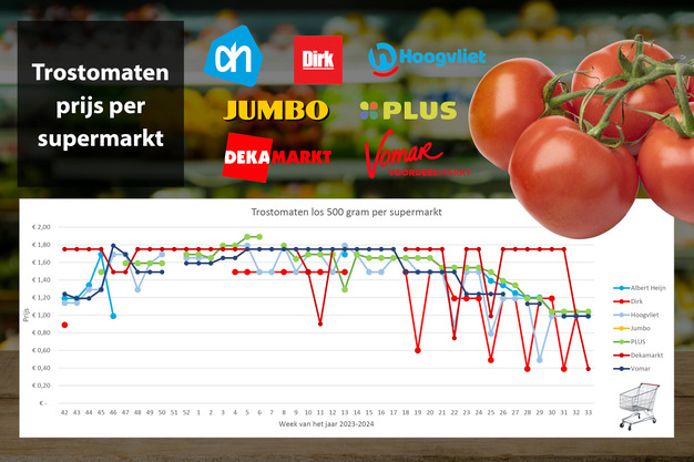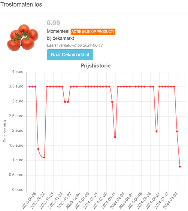 DekaMarkt rekent opvallend lage prijzen voor trostomaten. Terwijl de andere 5 supermarkten rond de euro rekenen voor 500 gram trostomaten, ligt de prijs van DekaMarkt op 0,39 eurocent (aanbieding), de vaste prijs ligt op 0,50 euro. Het is de laagte prijs in het afgelopen jaar voor DekaMarkt (zie onderstaande grafiek van de prijshistorie).