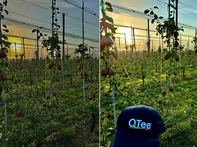 "Wat betreft de peren kunnen we eigenlijk redelijk tevreden zijn over de QTee", zo gaat hij verder. "De opbrengst is meegevallen en kwalitatief zien ze er eigenlijk heel goed uit. Er is wel wat vroege hagel gevallen toen de netten nog niet dicht waren, maar dat is er allemaal redelijk uit gegroeid. Nu hebben wij ook niet echt extreme hagel gehad. Op sommige plaatsen heeft het veel feller gehageld, waardoor je plaatselijk ziet dat men er veel meer de gevolgen van ondervindt, maar wij zijn er met de QTee goed vanaf gekomen."