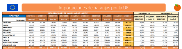 Tussen september 2023 en juli 2024 heeft Spanje 861.793 ton sinaasappelen geïmporteerd, 4,5% of 41.000 ton minder dan in dezelfde periode van 2022/23 en 12% of 92.500 ton meer dan het vijfjarig gemiddelde, zo blijkt uit een op 13 augustus gepubliceerd rapport van het Spaanse ministerie van Landbouw.