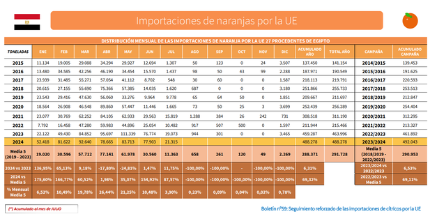 "De stijging is voornamelijk toe te schrijven aan de toename van de import uit Egypte, aangezien de rest van de landen het vijfjarig gemiddelde niet haalde", merkt het rapport op. De import uit Egypte nam met 6,3% toe (+29.000 ton) ten opzichte van vorig jaar (toen de importgegevens al hoog waren) en met 69,3% (+199.900 ton) ten opzichte van het vijfjarig gemiddelde. Het Noord-Afrikaanse land leverde 87,1% van de sinaasappelen afkomstig uit derde landen op de EU-markt. Het vergrootte daarmee zijn marktaandeel met 19 procentpunt.