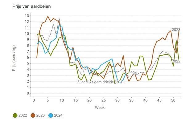 De aardbeienprijs herstelt zich en klimt op uit een zomerdal. Afgerond 3,44 euro per kilo in week 33 brengt de prijs terug tot net onder het vijfjarig gemiddelde. Teler Philip Van Overbeke signaleerde het prijsherstel. Hij geeft als mogelijke reden voor prijsherstel supermarktacties die vraag stimuleren.