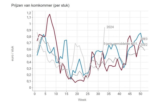 Sinds 2016 kan alleen de prijsvorming in week 33 in 2018 in de buurt komen. Ook rond mei steeg de komkommerprijs dit jaar al tot grote hoogten. Tussen de middenprijs in week 33 van dit jaar en die van vorig jaar zit ruim 60 eurocent.