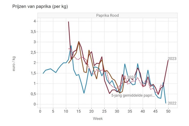 De stijging van de rode paprikaprijs brengt de middenprijs nog niet tot boven het vijfjarig gemiddelde. Voor rood is in week 33 gemiddeld net geen 1,30 per kilo betaald, voor groen 1,28 en voor geel 1,57. De prijs voor geel en groen zakt wel een stukje. Het is vooral de verdubbeling van de middenprijs van rood die opvalt.