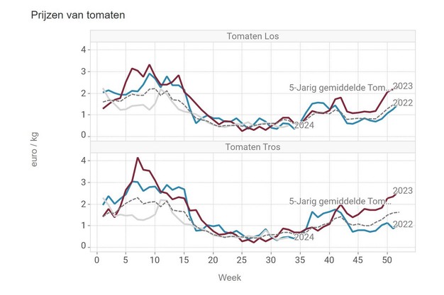 Een kleine stijging van de middenprijzen voor losse tomaten en trostomaten brengt de prijs nog niet boven het vijfjarig gemiddelde bij het VBT in week 33. Daarvoor is een gemiddelde kiloprijs van 51 eurocent voor losse tomaten en 47 eurocent voor trostomaten niet genoeg. De komkommerprijs kent een grote opleving en ook de prijzen voor rode paprika stijgen.