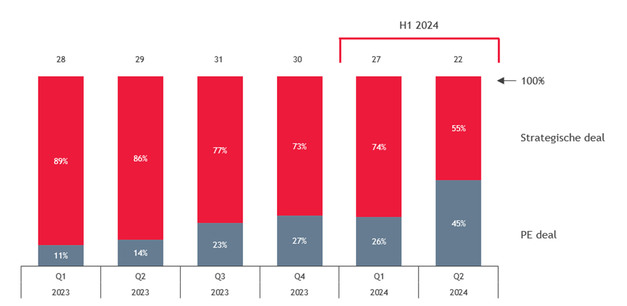 Hoewel het totale dealvolume ten opzichte van de tweede helft van 2023 daalde, is het aantal Private Equity-deals in de eerste helft van dit jaar zowel relatief als absoluut gestegen. De daling in het totale dealvolume kan dan ook worden toegeschreven aan de afname van het aantal deals door strategische kopers.