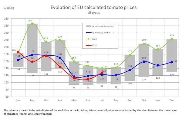 Met zulke kiloprijzen liggen de prijzen in alle gevallen nog wel boven de gemiddelde tomatenprijs die in juli is gerealiseerd. 1,28 euro per kilo is het EU-gemiddelde. Dat is, in tegenstelling tot de over de hele linie moeizame maand juni, weer iets boven het vijfjarig gemiddelde.