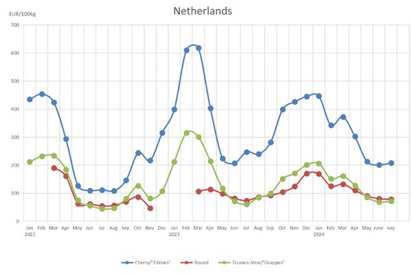 In Nederland ligt de gemiddelde kiloprijs voor cherry- en specialtytomaten nog altijd 73 procent hoger dan het vijfjarig gemiddelde. Voor Spanje, Italië en Frankrijk is dat anders. In Spanje liggen de prijzen hier 15 procent onder, in Frankrijk 8 procent en in Italië liggen de prijzen precies op het vijfjarig gemiddelde.