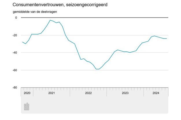 De stemming onder consumenten is in augustus niet veranderd in vergelijking met een maand eerder, meldt het CBS. Het consumentenvertrouwen kwam net als in juli uit op -24. Het oordeel over het economisch klimaat verslechterde, terwijl de koopbereidheid iets verbeterde.