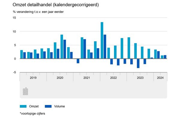 In het tweede kwartaal van 2024 nam de online omzet van detailhandelaren toe met 4 procent vergeleken met dezelfde periode een jaar eerder. Bij winkels die alleen online verkopen groeide de omzet in het tweede kwartaal met ruim 9 procent. Bij detaillisten die hun producten zowel online verkopen als via een fysieke winkel, ook wel multichannelers genoemd, nam de online omzet af met -2,5 procent.