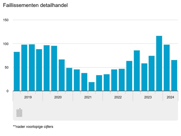 In het tweede kwartaal zijn 66 bedrijven in de detailhandel failliet verklaard. Dat is een toename van 12 procent vergeleken met het tweede kwartaal van 2023, toen werden 59 faillissementen uitgesproken. Het aantal faillissementen nam onder detailhandelaren minder sterk toe dan onder alle bedrijven (34 procent). Van alle uitgesproken faillissementen in het tweede kwartaal was ruim 6 procent een bedrijf in de detailhandel.