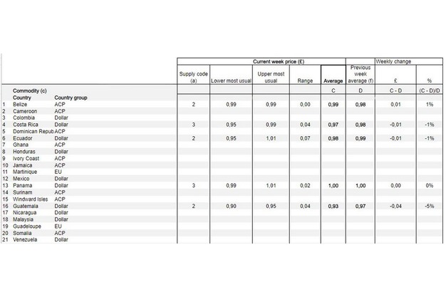 De huidige gemiddelde weekprijzen van bananen lagen op £0,99 (€1,17) voor bananen uit Belize, een stijging van 1% ten opzichte van vorige week, terwijl bananen uit Ecuador deze week met 1% daalden tot £0,97 (€1,15). Bananen uit Panama kostten £1,00 (€1,18) per kg, een stijging van 0% vergeleken met vorige week. Bananen uit Costa Rica werden verkocht voor £ 0,97, terwijl bananen uit Guatemala deze week eveneens £ 0,97 kostten.