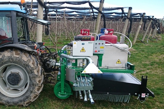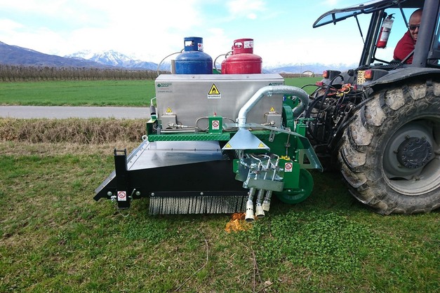 "Het werktuig wordt getrokken door een tractor en werkt op LPG-gas in commerciële vaten. De wielen hebben een diameter van 400 mm en kunnen in positie en hoogte worden versteld."