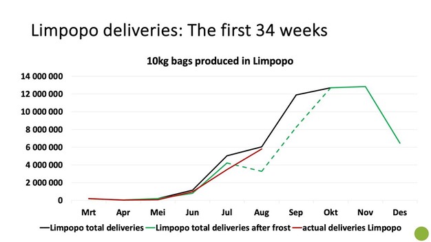 Voor Limpopo komt de opbrengstdaling neer op 13% van hun gemiddelde jaarlijkse oogst van 56 miljoen zakken. "Echter, wat er tussen september en december in Limpopo gebeurt, speelt een grote rol in wat er in het land gebeurt. Als Limpopo aan de markt levert, hebben ze een marktaandeel van ongeveer 80%."