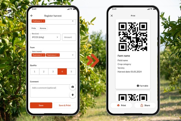 De Farmable App maakt het mogelijk om geoogste partijen te registreren. Telers kunnen oogstlabels afdrukken voor elke bestaande registratie van een oogst. Dit kan eenvoudig gebeuren tijdens het invoeren van de partijgegevens of op een later moment door terug te gaan naar historische records en labels af te drukken indien nodig.