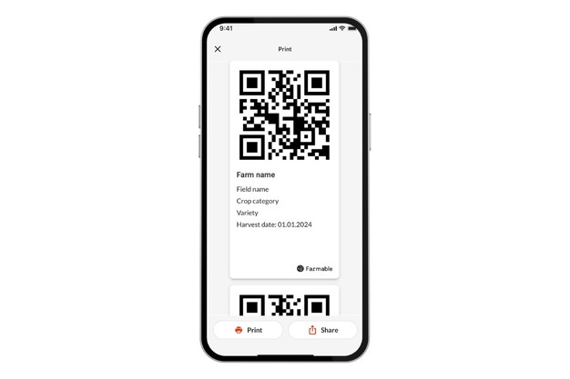 Op deze manier krijgen telers professioneel uitziende etiketten met alle belangrijke gegevens: Veldnaam, Gewascategorie, Gewasvariëteit en Oogstdatum. Je kunt het etiket eenvoudig delen via een van je gebruikelijke telefoonapps zoals WhatsApp, sms of e-mail, of afdrukken op een aangesloten printer.