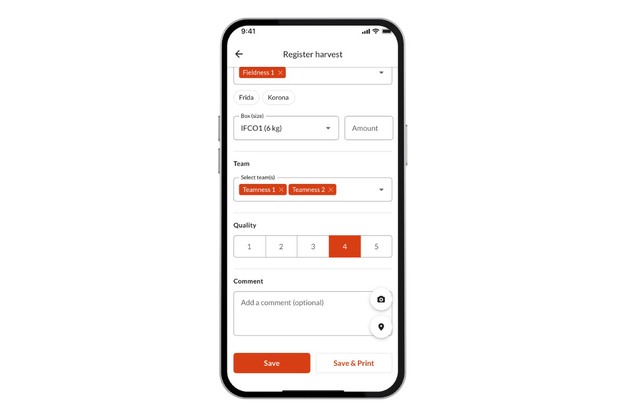 Registreer oogstpartijen met essentiële gegevenspunten: veldnaam, kistgrootte en kistaantal of als alternatief totaalgewicht, kwaliteitsbeoordeling. Er is ook de mogelijkheid om afbeeldingen, exacte GPS-coördinaten en extra opmerkingen over elke oogstpartij toe te voegen.
