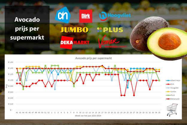 Prijsdata zijn afkomstig van Supermarktscanner.nl en gebaseerd op de online prijzen in de webwinkels van Albert Heijn, Jumbo, Plus, DekaMarkt, Dirk en Hoogvliet. De prijs is een gemiddelde, inclusief de promoties. In deze prijsvergelijking zijn herkomst en kwaliteit niet meegenomen. De meeste supermarkten vermelden deze gegevens niet op hun website, Hoogvliet en Jumbo vermelden het land van herkomst. Mogelijk worden in de bovenstaande prijsvergelijking onrijpe avocado's met rijpe vergeleken en Spaanse komkommers met Hollandse.