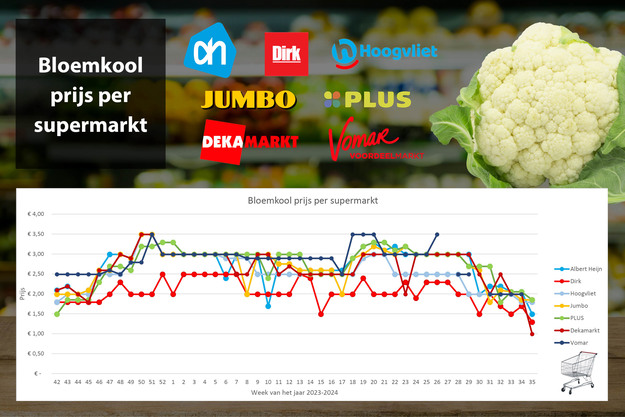 Prijzen gaan de diepte in met bloemkool. DekaMarkt heeft in week 35 de laagste prijs door bloemkool in de aanbieding te doen voor 99 cent. Dirk volgde met een aanbieding van 1,29 cent per stuk. Opvallend genoeg kunnen klanten van Vomar geen bloemkool bestellen in de online winkel.