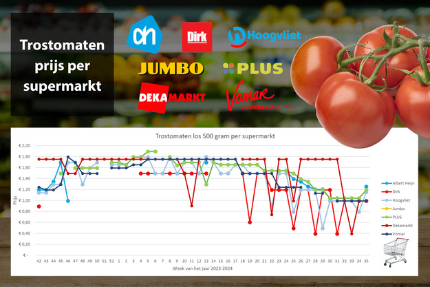 Losse trostomaten zijn week 35 terug in het online assortiment bij AH, flink duurder dan in week 33 (toen 1,04 euro, in week 35 1,25 euro per 500 gram). Ook Hoogvliet en PLUS verhogen de prijzen met respectievelijk 36 en 15 eurocent. Dirk, DekaMarkt en Vomar blijven onder de euro.