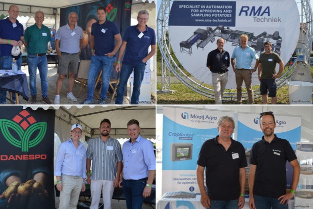 Talrijke vertegenwoordigers van de internationale aardappelsector ontmoetten elkaar op een zonnige dag. Met de klok mee: vertegenwoordigers van de Duitse bedrijven EZG Hessen, Res Naturae en Huntegold; Michel Remijn van RMA verwelkomde Josef Färber van KCB, een dochteronderneming van de Weuthen Group, en Aviko-vertegenwoordiger Erwin Roßkopf op de stand; Karl Lentzen, aardappelgroothandel in Viersen en accountmanager voor Duitsland bij De Mooij met zijn collega Hans van de Oever; Johannes Dankers en Maximilian Döink op bezoek bij Christian Oßwald van Danespo.