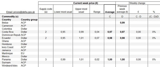 De huidige gemiddelde weekprijzen van bananen lagen op £0,99 (€1,17) voor bananen uit Costa Rica, dezelfde prijs als vorige week. De prijzen voor bananen uit Ecuador waren eveneens dezelfde als vorige week: £0,98 (€1,16). Bananen uit Panama kostten £1,00 (€1,18) per kg, ook dezelfde prijs als vorige week.