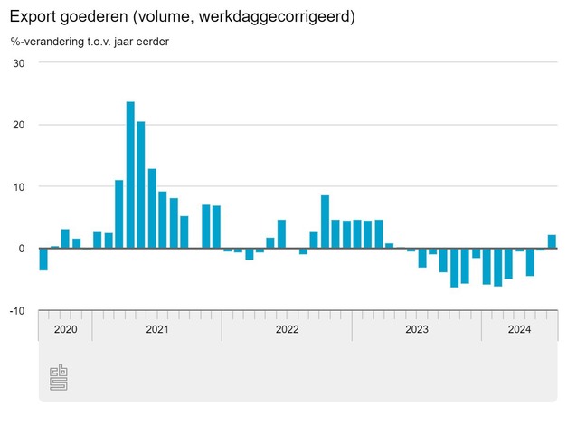 Het volume (werkdaggecorrigeerd) van de goederenexport was in juli 2,2 procent groter dan in juli 2023, meldt het CBS. Vooral de uitvoer van voeding- en genotsmiddelen, chemische producten, en elektrotechnische machines en optische apparaten was hoger. Ook hebben bedrijven meer basismetaal en metaalproducten uitgevoerd. Het volume van de goederenimport was in juli 0,7 procent kleiner dan in juli 2023. In de CBS Exportradar van september waren de omstandigheden voor de export ongunstiger dan in de radar van juli.