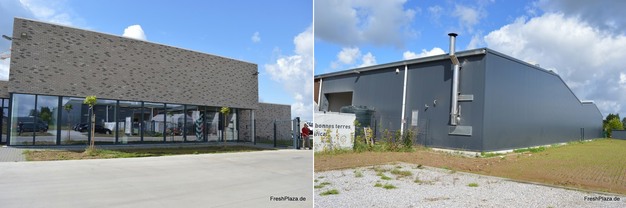 Het kantoorpand (l) en de productiehal vanaf de buitenkant.