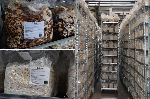 Blik in het productieproces van Eclo: Linksboven shiitake-substraat, daaronder Erengi-substraat. Rechts substraat-blokken tijdens de incubatiefase.