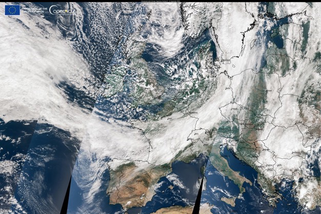 Dit Copernicus Sentinel-3 beeld, gemaakt op 11 september 2024, bewijst dat een koufront de kusten van Frankrijk, België en Nederland nadert op weg naar Centraal-Europa.