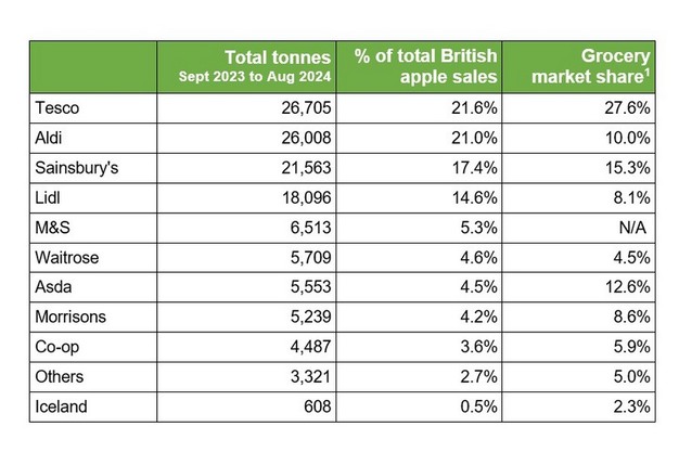 In het jaar dat begon in september 2023, verkocht Tesco 26.705 ton Britse appelen, net voor Aldi, dat 26.008 ton verkocht en vorig jaar nog de toppositie innam. De derde en vierder plaats zijn voor respectievelijk Sainsbury's met 21.563 ton verkochte appelen en Lidl met 18.096 ton.