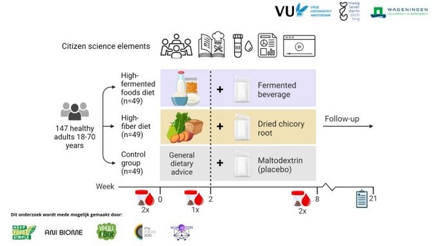 De studie is uitgevoerd onder leiding van Food Health & Consumer onderzoeker dr. Nicole de Wit (WUR) en hoogleraar microbiologie Remco Kort (VU). In het onderzoek werden de effecten van een dieet rijk aan voedingsvezels en een dieet hoog in gefermenteerde voedingsmiddelen op het darmmicrobioom onderzocht. Door de integratie van elementen van citizen science werden de deelnemers actief betrokken bij het onderzoek. Deelnemers ontvingen voorlichting over het darmmicrobioom en persoonlijke rapporten over hun darmmicrobioom. De dieetinterventie hield rekening met de persoonlijke voorkeuren van de deelnemers en de deelnemers zelf verzamelden alle uitkomsten (waaronder bloed en ontlasting). Verder maakten enkele deelnemers vlogs over hun bevindingen. Deze video's zullen straks gebruikt worden voor disseminatie van de resultaten.