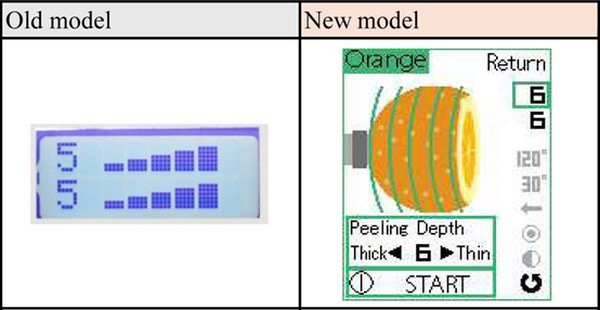 "De grootste verandering is het nieuwe kleurenscherm. Het oude model gaf alleen de schildiepte en draaisnelheid weer met twee getallen, maar nu geeft het display veel meer informatie, waaronder korte animaties die laten zien hoe fruit moet worden ingevoerd en hoe verschillende instellingen de schilkwaliteit beïnvloeden. Dit maakt de machine veel begrijpelijker, waardoor de kans op onjuist gebruik afneemt."