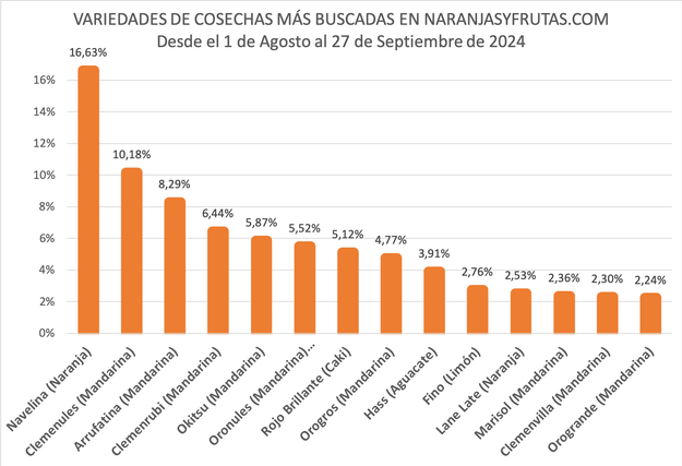 Juan José Bas, manager van Naranjasyfrutas.com: "We hebben een kleine samenvatting gemaakt van de 14 meest gezochte variëteiten van 1 augustus tot 27 september 2024. De resultaten per variëteit, in volgorde, zijn: Navelina, Clemenules, Arrufatina, Clemenrubí, Okitsu, Oronules, Rojo Brillante, Orogros, Hass, Fino, Lane Late, Marisol, Clemenvilla en Orogrande."