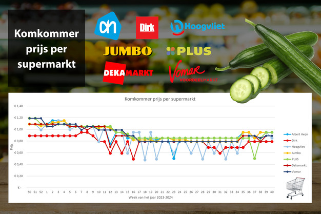 Albert Heijn en Hoogvliet verlagen de komkommerprijs met 10 cent naar 85 cent per stuk. Andere supermarkten zitten daar 6 tot 10 cent boven. Jumbo rekent nog 95 cent per komkommer in week 40 en is daarmee, net als met bloemkool, 10 cent duurder dan Albert Heijn.