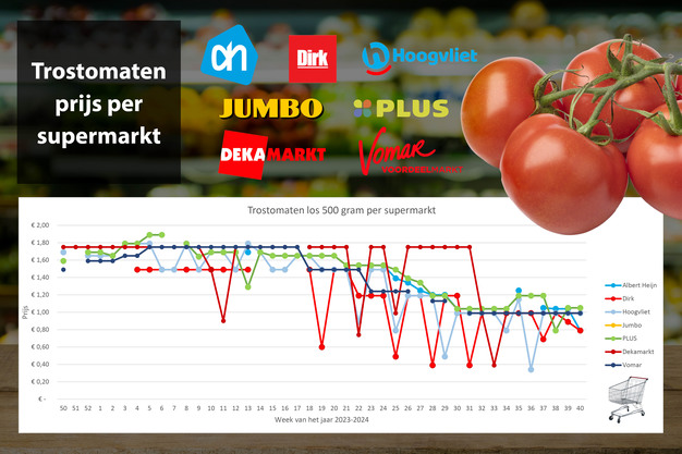 Albert Heijn en Dirk doen beide losse trostomaten 500 gram in de aanbieding, in week 40 kosten deze 0,79 cent. Bij de andere supermarkten blijft de prijs stabiel tussen de 0,99 en 1,05 euro.