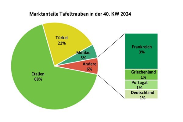 Het aanbod van Italiaanse druiven domineerde de Duitse markt, met veel verschillende Arra- en IFG-variëteiten in voorraad. Italia en Crimson Seedless wonnen iets aan belang, terwijl Red Globe aan relevantie verloor. Volgens BLE was Victoria, die vroeger de toon zette, bijna volledig uit de handel verdwenen. Uit Turkije waren de belangrijkste rassen Sultana en, in mindere mate, Crimson Seedless: beide rassen werden snel met een aantrekkelijke kwaliteit op de markt gebracht.
