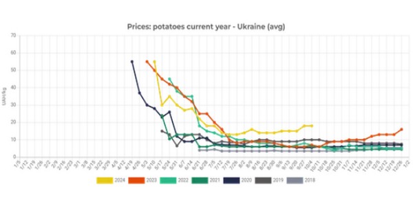Momenteel bieden Oekraïense telers aardappelen te koop aan tegen 17-25 UAH/kg (€0,37-0,55/kg), waarbij de prijzen in Oekraïne de afgelopen week met gemiddeld 19% zijn gestegen. De grote vraag van grossiers, die aardappelen blijven kopen voor de bewaring, blijft de belangrijkste reden voor de prijsstijging in dit segment. Bovendien hebben zware regens in sommige regio's de aardappeloogst bemoeilijkt, wat de prijsstijgingen voor deze producten verder ondersteunt.