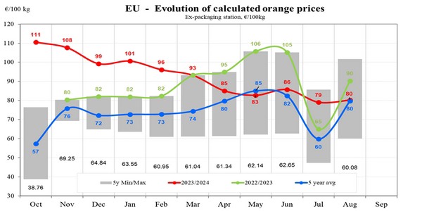 De gewogen gemiddelde prijs voor sinaasappelen in de EU (in € per 100 kg) kwam uit op €80,21. Dat is een daling van maar liefst 11,12% ten opzichte van augustus 2023 en slechts 0,57% boven het 5-jarig gemiddelde.