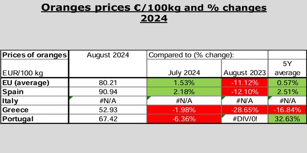 In Spanje kwamen de sinaasappelprijzen uit op €90,94 per 100 kg, wat 2,51% hoger is dan het 5-jarig gemiddelde en een daling van 12,10% op jaarbasis. In Portugal lag de prijs op €67,42 per 100 kg, wat 32,63% (!) boven het 5-jarig gemiddelde ligt.
