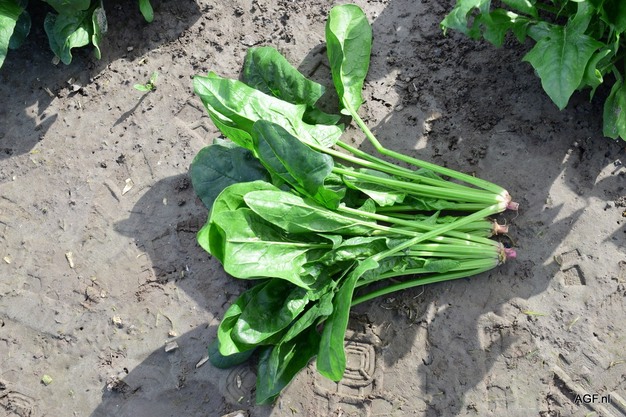 Bunching spinazie, dit ras is voor de Japanse markt, met een grof blad, groene steel en roze wortelpunt