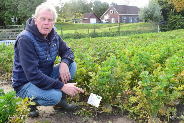 Arno voor het door bladvlekkenziekte aangetaste demoveld met knolselderij waarin Tarvos goed presteert