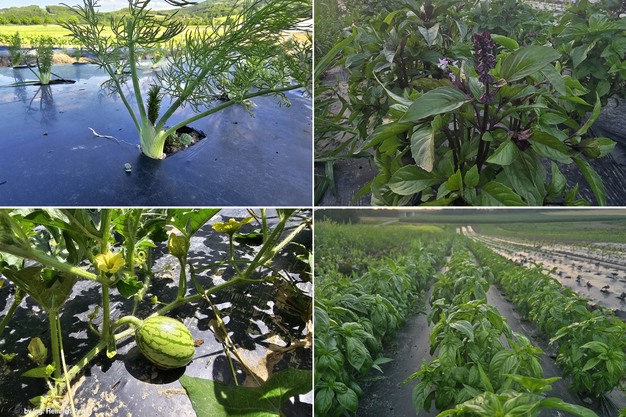 De meeste gewassen worden geplant op afbreekbare mulchfolie. Met de klok mee: venkel, kaneel, Genovese basilicum en watermeloen.