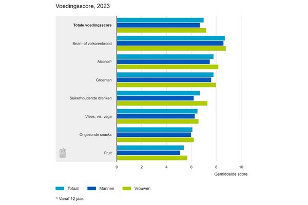 In 2023 zijn in de Gezondheidsenquête nieuwe vragen over voeding opgenomen. Deze vragen gaan over indicatoren voor gezonde voeding, namelijk het eten van vlees en vis, fruit, groente, suikerhoudende dranken, brood, en ongezonde snacks. Op basis van de antwoorden op deze vragen en informatie over alcoholgebruik (vanaf 12 jaar), is per indicator een voedingsscore berekend, en een totaalscore gebaseerd op de afzonderlijke indicatoren samen. Deze scores lopen van 0 tot en met 10; een hogere score geeft aan dat de voeding voor deze voedingsindicator meer in lijn is met de adviezen van het Voedingscentrum.