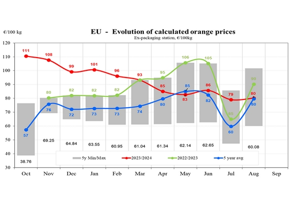 In Portugal kostten sinaasappels €82,24 per 100 kg, een stijging van 21,75% ten opzichte van de maand ervoor, en in Griekenland lagen de prijzen op €71 per 100 kg, een stijging van 30,18% ten opzichte van augustus 2024.